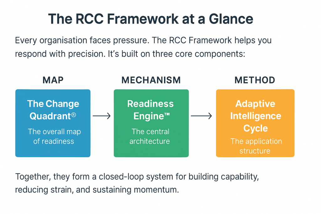 Unreadiness is a system constraint, not a people problem. Until you strengthen the system, individuals will keep struggling in predictable ways. The Readiness-Centred Change™ architecture helps you achieve that.