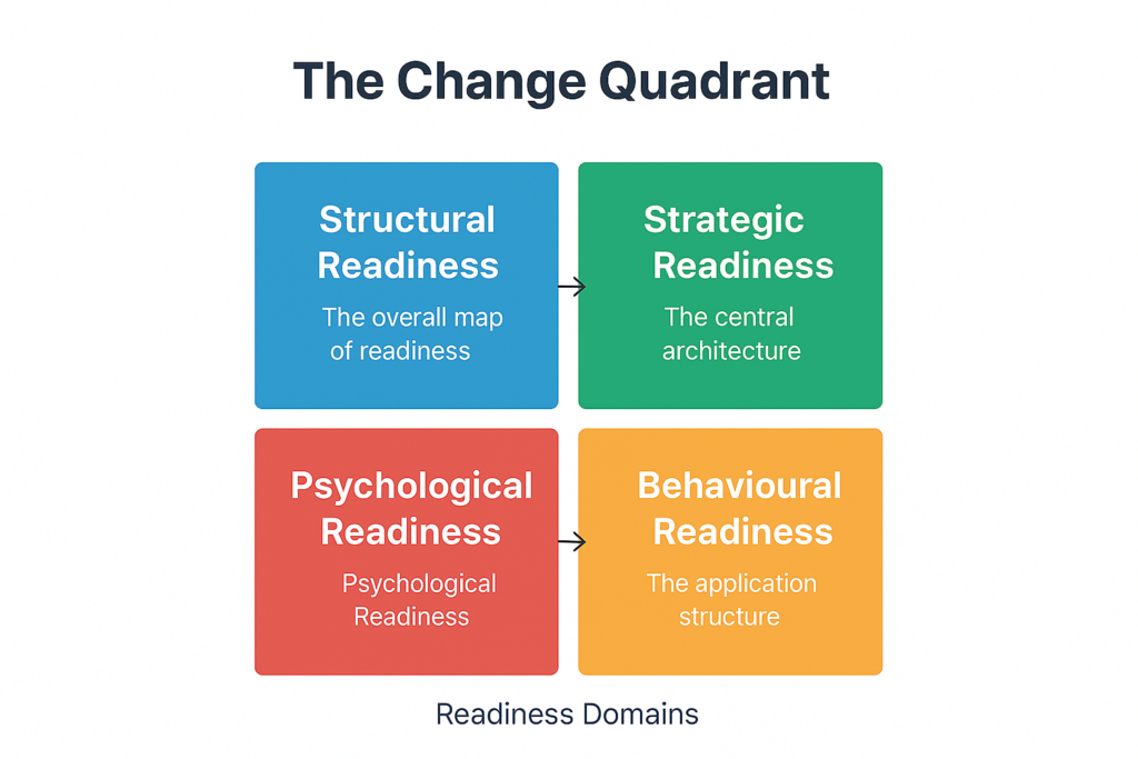 The Change Quadrant® — Your Map of Readiness Every organisation operates under pressure. The Change Quadrant® reveals the four conditions that determine whether your system can adapt, align, and perform.