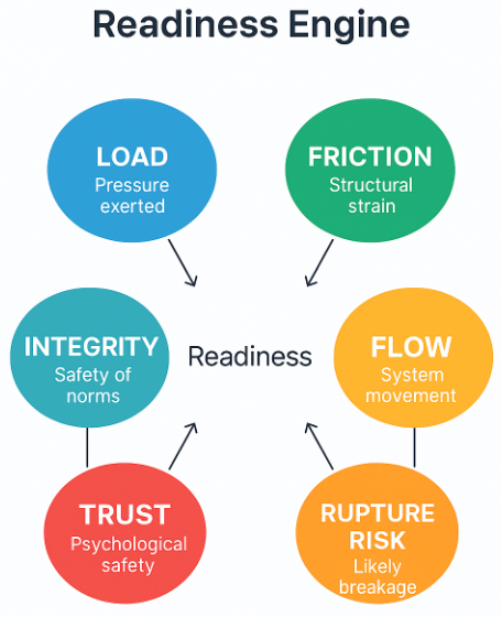 It integrates the four conditions of The Change Quadrant® with six systemic forces — Load, Friction, Flow, Integrity, Trust, and Rupture Risk — to reveal what’s really driving performance under pressure.